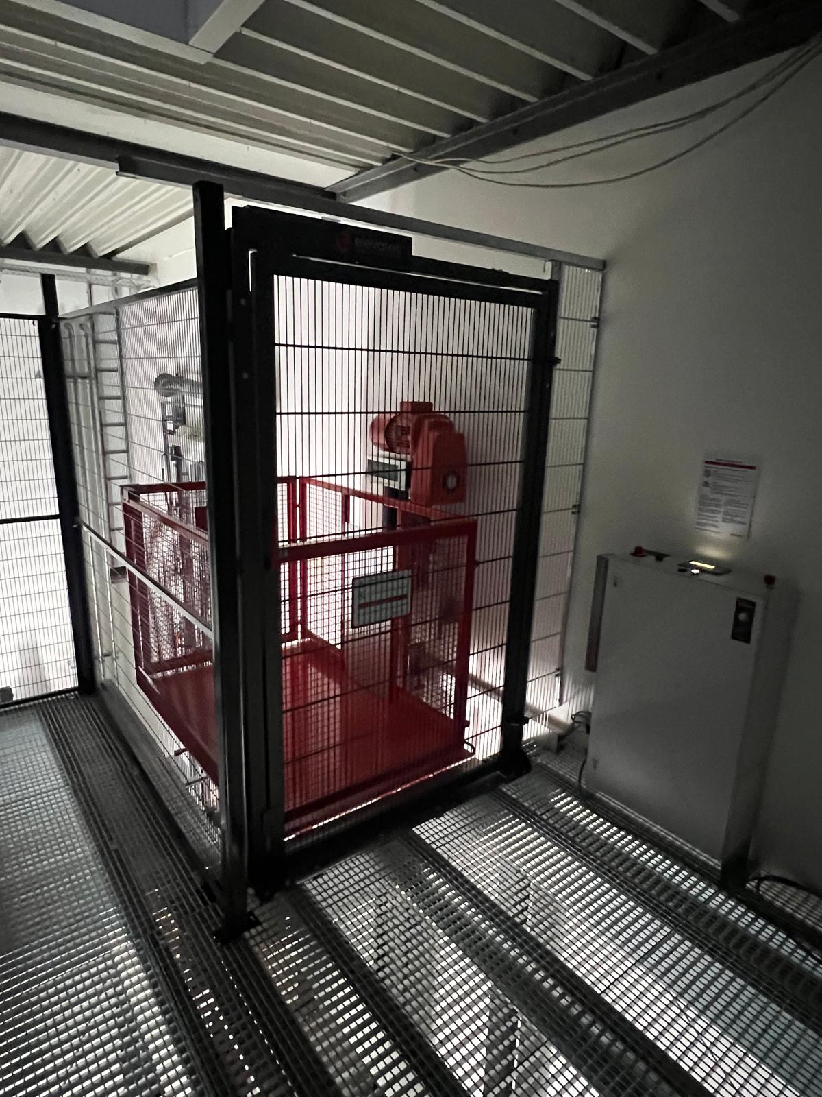 - Enceinte avec clôture de protection des machines massive et galvanisée du système modulaire elevatec hauteur 2.400 mm (autres dimensions possibles) avec mailles de 20 x 200 mm selon la directive sur les machines 2006-42-CE, EN 81-31